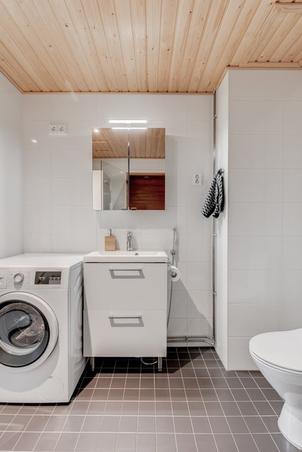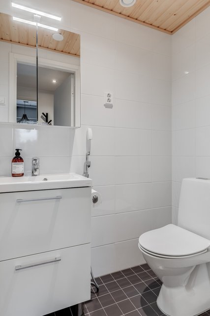 - WC-istuin, suihkuseinä, pesukoneliitäntä, lattialämmitys, peilikaappi, allaskaappi, bidee-suihku, ja pesuallas