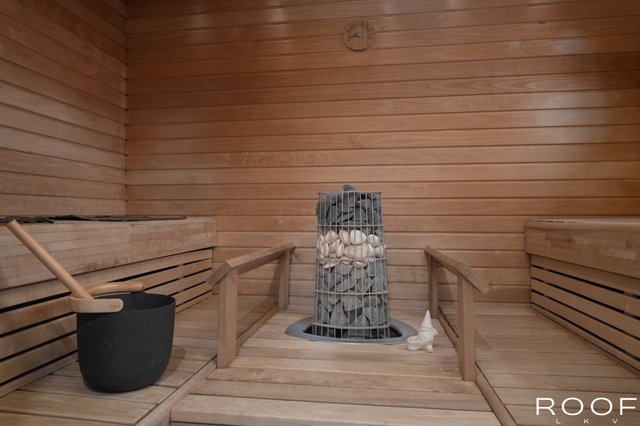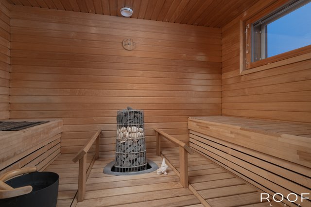 - Varustus: Kiuas, Lauteet Seinät: Paneeli Lattia: Laatta