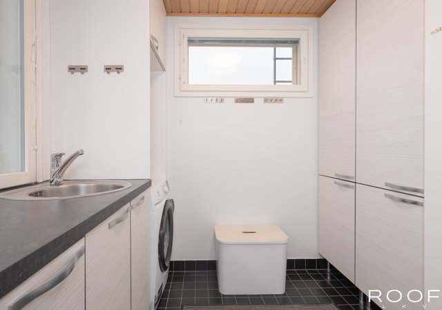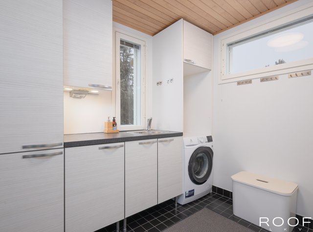 - Varustus: - Allaskaapisto ja runsaat kaappi- ja säilytystilat - Työtaso ja upotettu teräsallas - Pesukoneliitäntä ja paikka pesukoneelle - Useita seinäkoukkuja ja ripustuspaikkoja - Ikkunat kahteen suuntaan tuomassa luonnonvaloa Lattia: - Musta, mattapintainen laatta Seinät: - Vaaleat, maalatut seinäpinnat - Yläosassa leveät ikkunat valkoisin karmoin - Osin kaapistoilla ja kiintokalusteilla varustetut seinät
