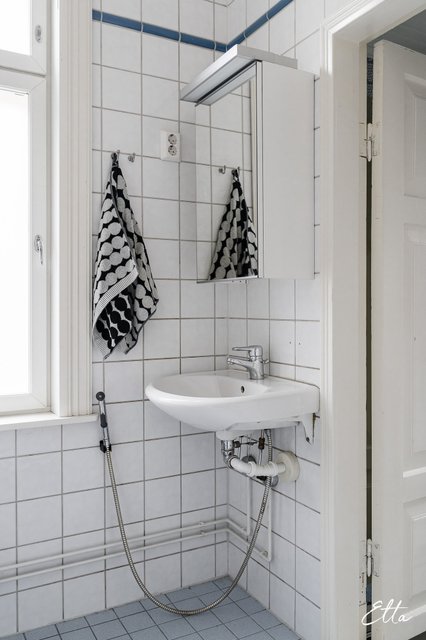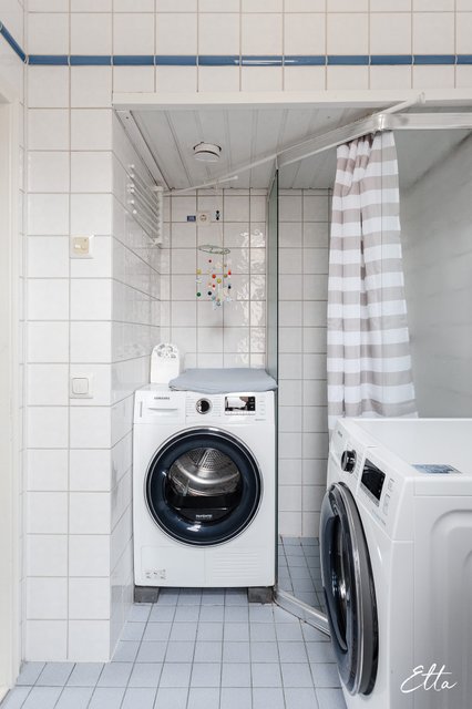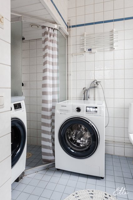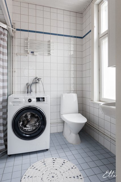 - WC-istuin, suihku, suihkuseinä, pesukoneliitäntä, lattialämmitys, peilikaappi, pesuallas, ja bidee-suihku