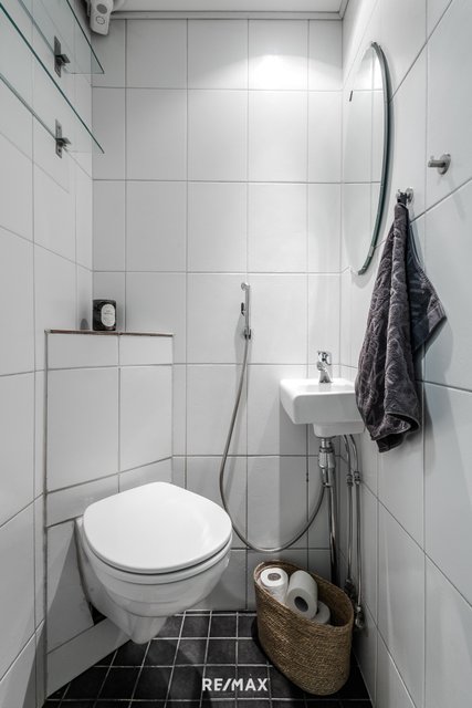 - Peili, suihku, lattialämmitys, allaskaappi, suihkuseinä, pesuallas, ja pesukoneliitäntä