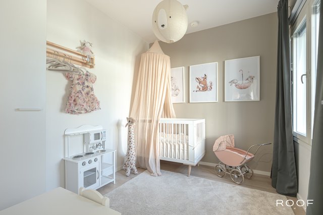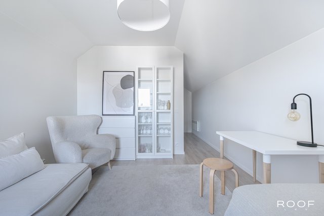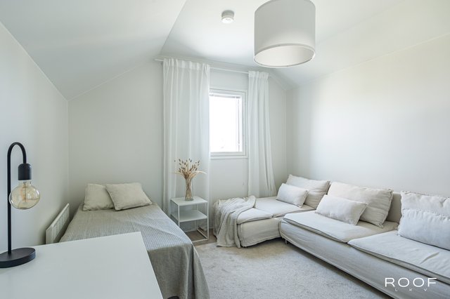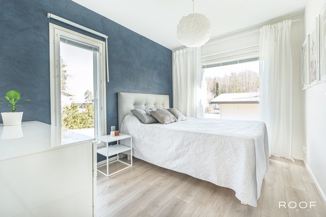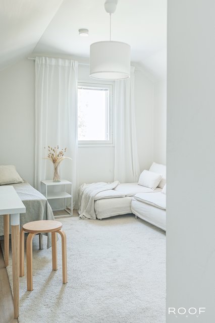 Yläkerrassa omassa rauhassaan on kodin kolmas makuuhuone, joka taipuu moneen asukkaiden tarpeiden mukaan. Lisäksi yläkerrasta löytyy asunnon toinen erillinen wc ja vaate-/varastohuone, joka muuntuu vaikka työ- tai pelitilaksikin.