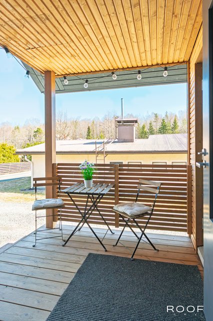 Takapihalla olohuoneen edustalla on osittain katettu reilun kokoinen terassi, johon aurinko alkaa taittaa kesäisin puolesta päivästä alkaen. Etuoven äärellä on puolestaan lämmin varasto ja pieni terassi, johon mahtuu vaikkapa pikku pöytä tuoleineen aamukahvipaikaksi. Talon päädyssä on kaksi autopaikkaa. Kiinteistön hallinnasta on sovittu hallinnanjakosopimuksella.