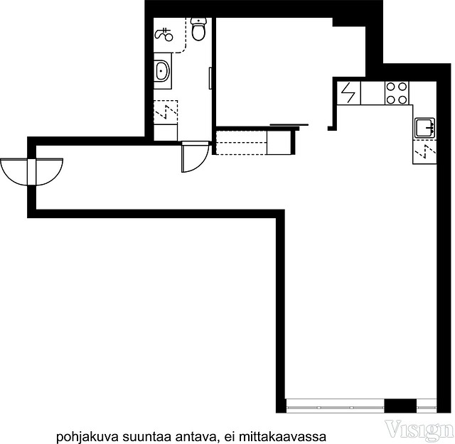 - Makuualkovi on erotettu olohuoneesta liukuovella, ei ikkunaa.