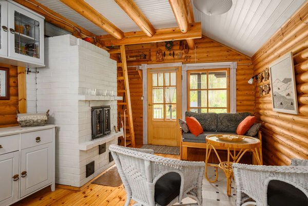 keittiö, olohuone, makuuhuone, takkahuone, matala makuuparvi, kuisti ja terassi