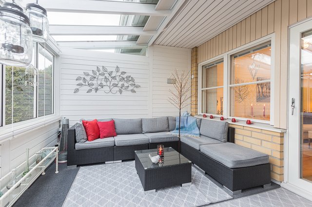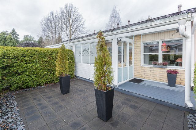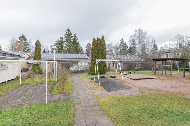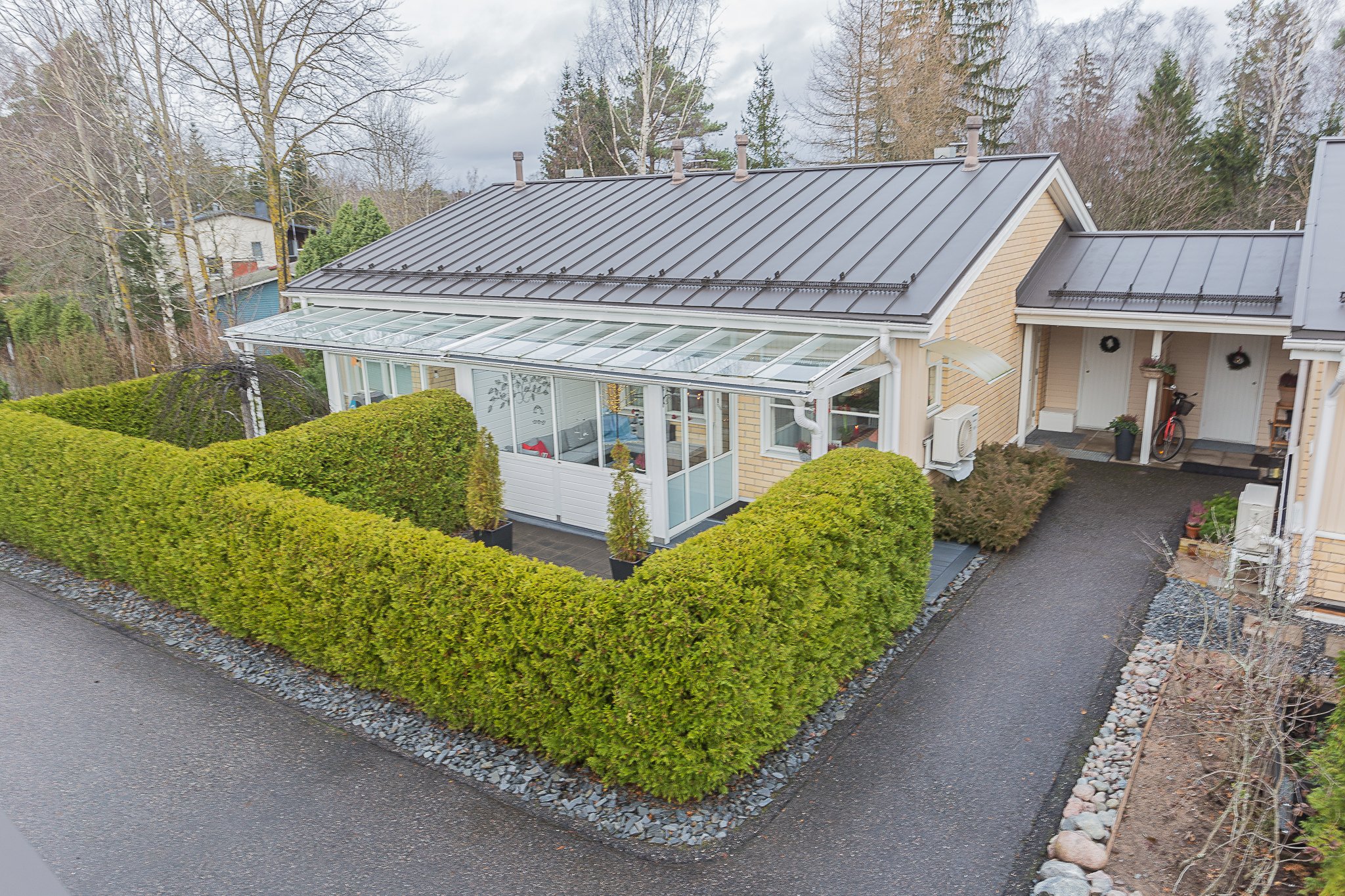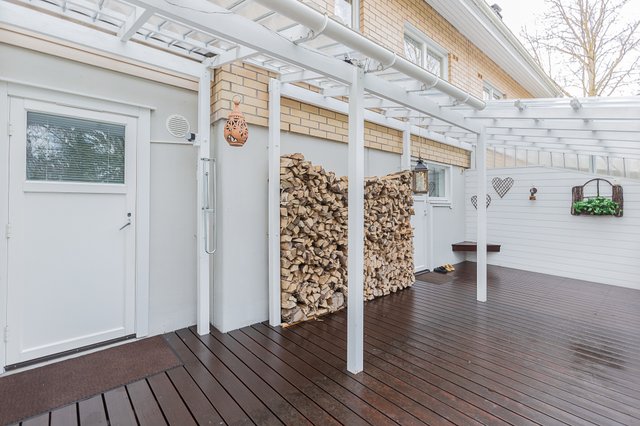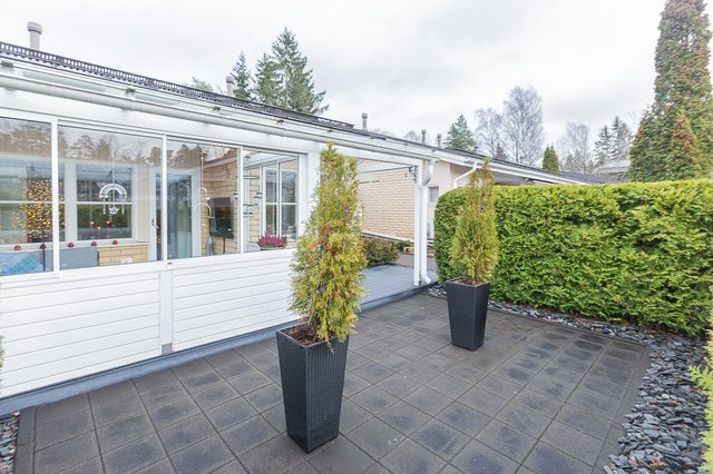 Ulkotilat ovat yksi tämän kodin suurimmista vahvuuksista. Etelään avautuva etupiha sekä pohjoisen suuntaan avautuva takapiha katettuine terasseineen ovat molemmat reilunkokoisia ja monikäyttöisiä. Valoa tulviva etupihan lasitettu terassi pidentää ulkona oleskelun kautta ja tarjoaa viihtyisän paikan niin aamukahville kuin illanviettoonkin.