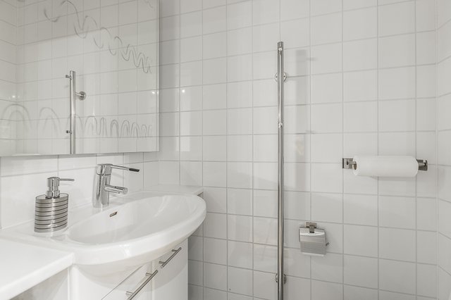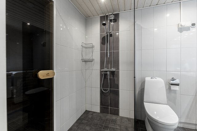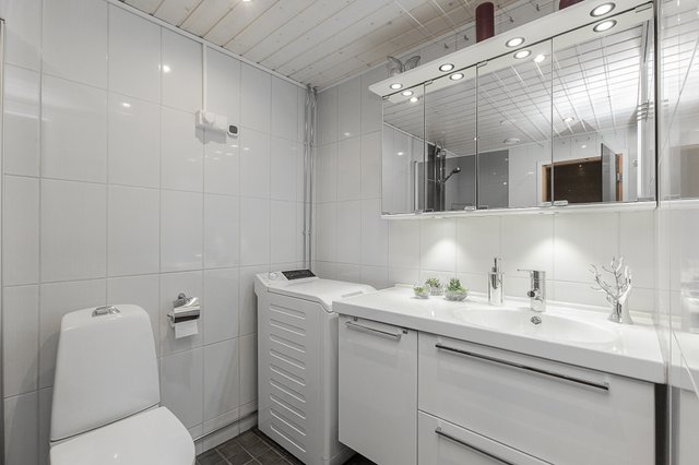 - Lattialämmitys, suihku, suihkuseinä, peilikaappi, wc-istuin, allaskaappi, bidee, pesukoneliitäntä.