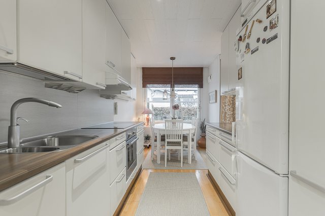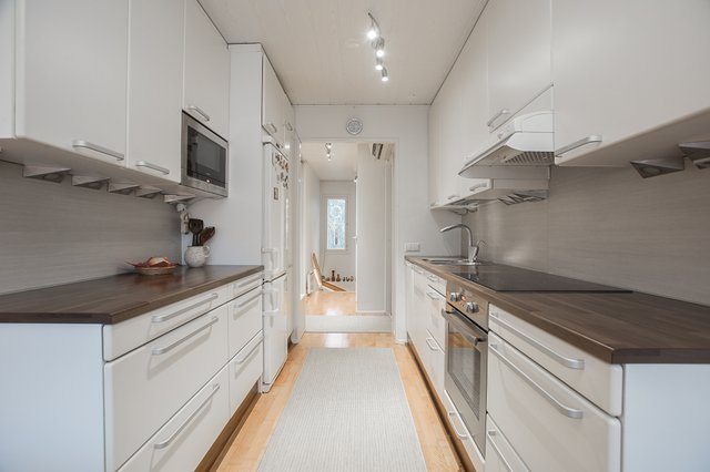 - Kaapistot, tasot, jääkaappi/pakastin, keraaminen liesitaso, erillisuuni, liesituuletin, integroitu mikro, integroitu astianpesukone (45 cm). Välitila: Levy.