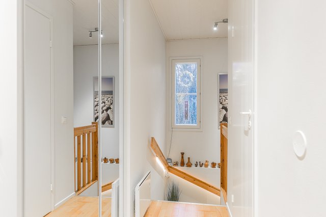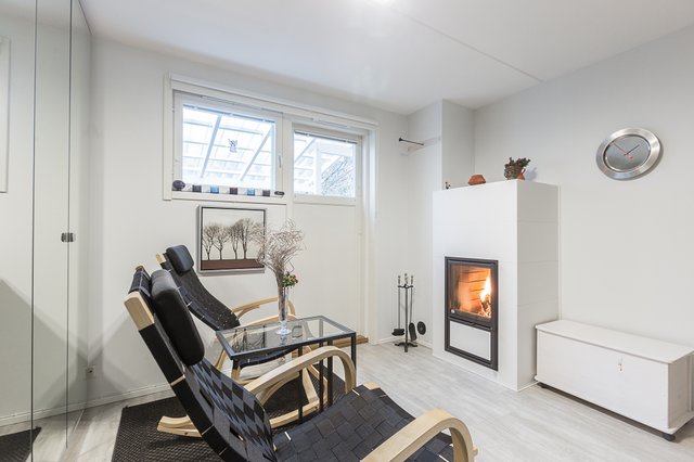 Takkahuonetta koristaa uusittu varaava takka, joka tuo lämpöä ja tunnelmaa, ja eteisen ilmalämpöpumppu huolehtii energiatehokkaasta lämmityksestä ja kesäajan viilennyksestä. Molemmissa kerroksissa on wc, mikä lisää asumisen käytännöllisyyttä.