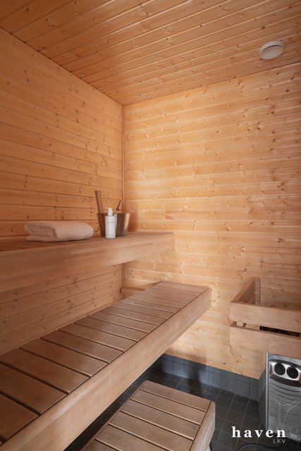 - Oma tilava sauna sähkölämmitteisellä kiukaalla.