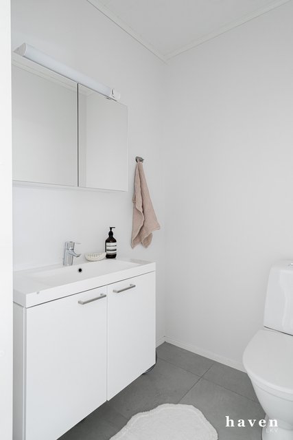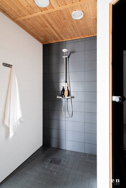 - Tilava laatoitettu kylpyhuone lattialämmityksellä. Suihkunurkkaus, pesukoneliitäntä ja oma tila pesutornille. Runsaasti kaappi- ja laskutilaa, vesipiste ja wc.