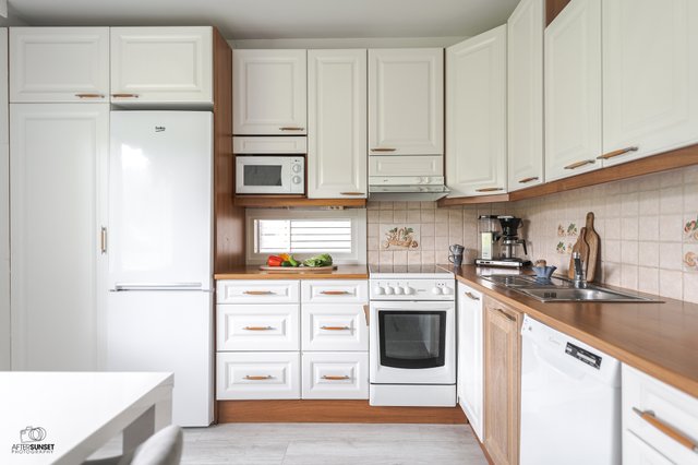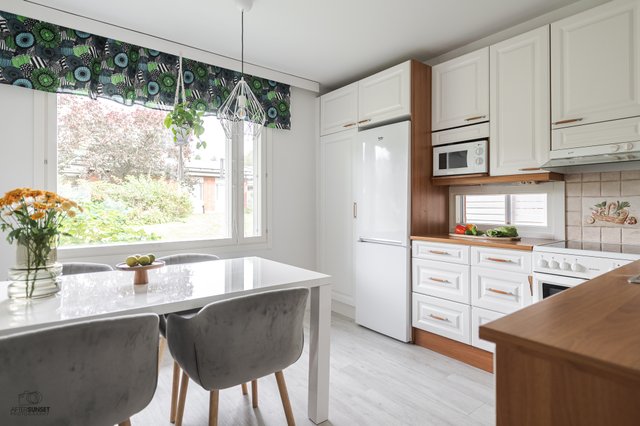 - Varustus: jääkaappi/pakastin, liesituuletin, astianpesukone. Liesi: sähköliesi. Työtasot: laminaatti. Lattia: vinyyli. Seinät: kaakeli, maalattu.
