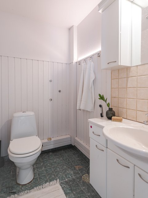 - Varustus: peilikaappi, bidee-suihku. Lattia: laatta. Seinät: kaakeli, maalattu.