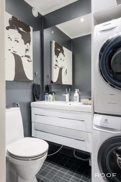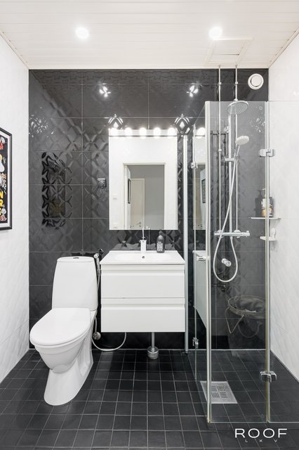 - Suihkukaappi, lattialämmitys, wc-istuin, peilikaappi, allaskaappi, ja suihku