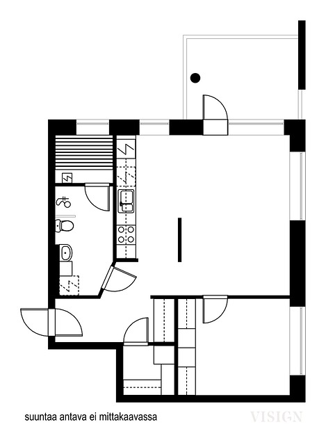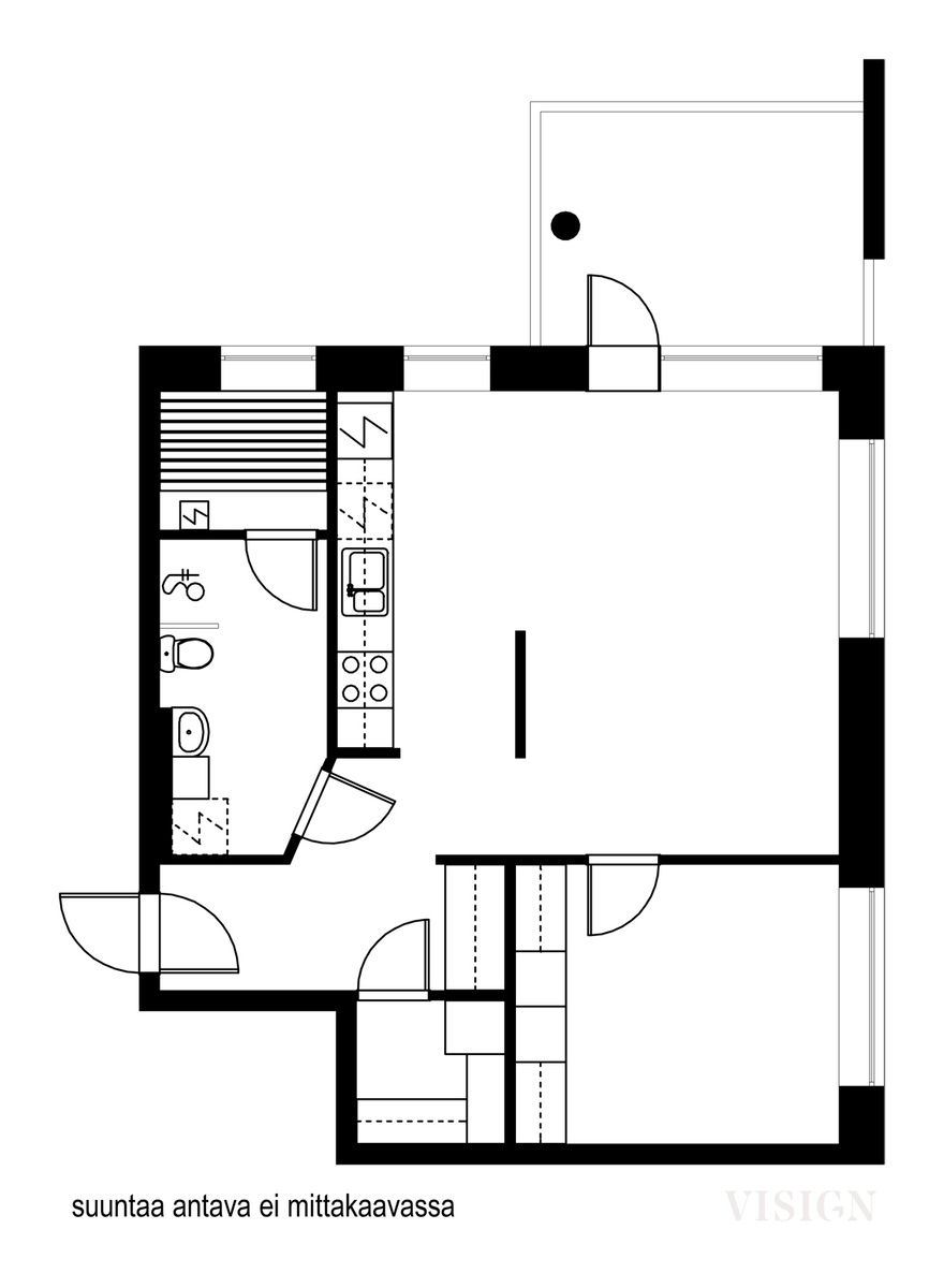 Avara keittiö ja olohuone muodostavat yhtenäisen ja valoisan oleskelutilan, jonka jatkeena on tilava lasitettu parveke. Makuuhuoneessa on reilusti kaappitilaa ja lisäksi käytössäsi on erillinen vaatehuone. Kylpyhuone on poikkeuksellisen tilava, ja oma sauna viimeistelee arjen mukavuudet.