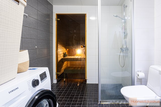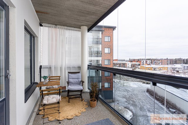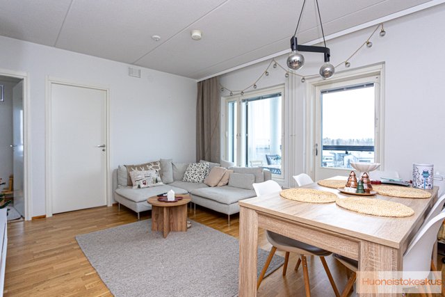 Asunnossa on tilava olohuone, joka yhdistyy saumattomasti keittiöön, jossa on kaikki tarvittavat mukavuudet, kuten jääkaappipakastin, astianpesukone ja keraaminen liesi. Kaksi makuuhuonetta tarjoavat rauhalliset puitteet levolliseen uneen. Kylpyhuoneessa on lattialämmitys ja oma sauna, mikä tekee arjesta erityisen miellyttävää. Itään avautuva lasitettu parveke tarjoaa viihtyisän paikan aamukahvin nauttimiseen.
