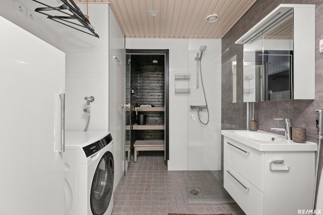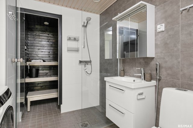 - WC-istuin, suihku, suihkuseinä, pesukoneliitäntä, lattialämmitys, peilikaappi, pesuallas, allaskaappi, ja bidee-suihku