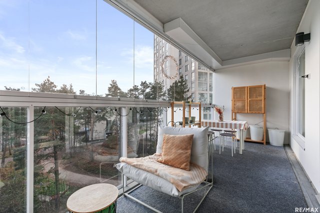 - Parvekeseinät maalauspinnointettuja betonisandwich-elementtejä. Katto harmaa betonipinta. Parvekelaatat teräsbetonielementtejä, lattiapintana betonipinta ja neulehuopamatto. Parvekeovi valkoinen, kaksiosainen Profinlasiliukuovi. Parvekekaiteet alumiinirunkoisia lasikaiteita, parvekkeiden lasi kirkas/opaali. Kaiteiden yläpuolinen pääosin avattava parvekelasitus.
