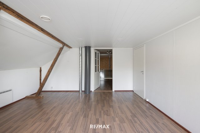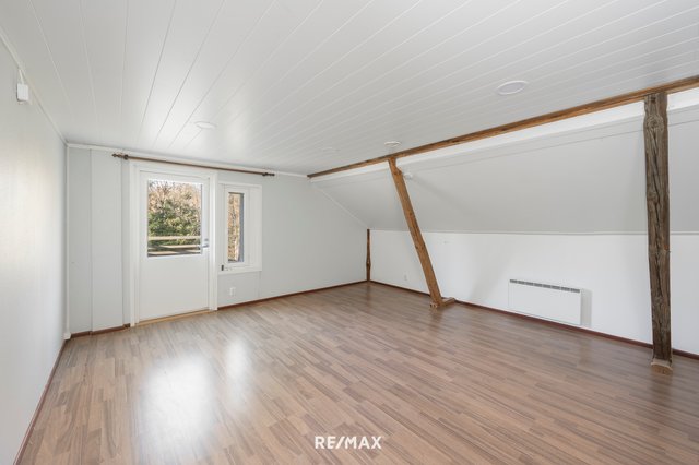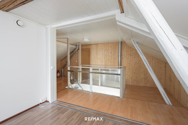 Yläkerran suuri makuuhuone jaettu väliseinällä erilliseksi huoneeksi aulatilasta.
