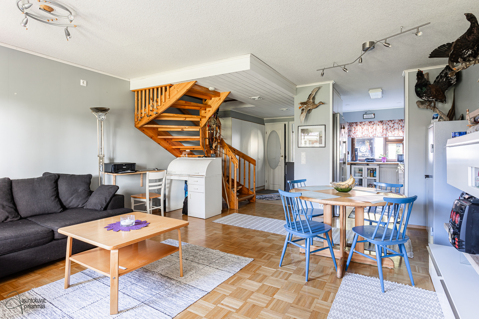 Alakerrassa sijaitsevat keittiö ja tilava olohuone, jotka muodostavat toimivan ja selkeän kokonaisuuden. Olohuoneessa on runsaasti tilaa ruokailuryhmälle ja oleskeluun. Olohuoneesta on käynti takapihalle.