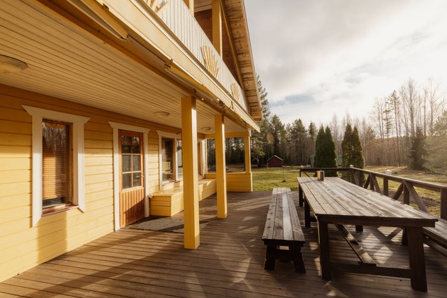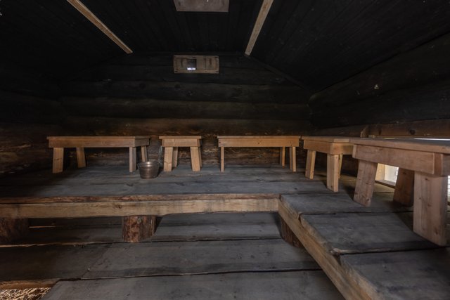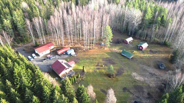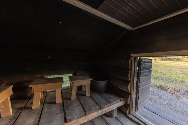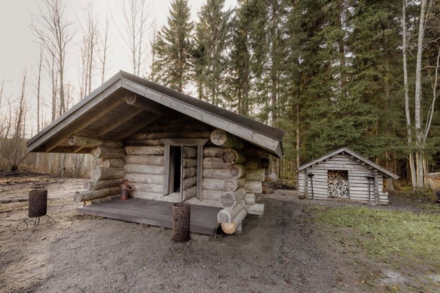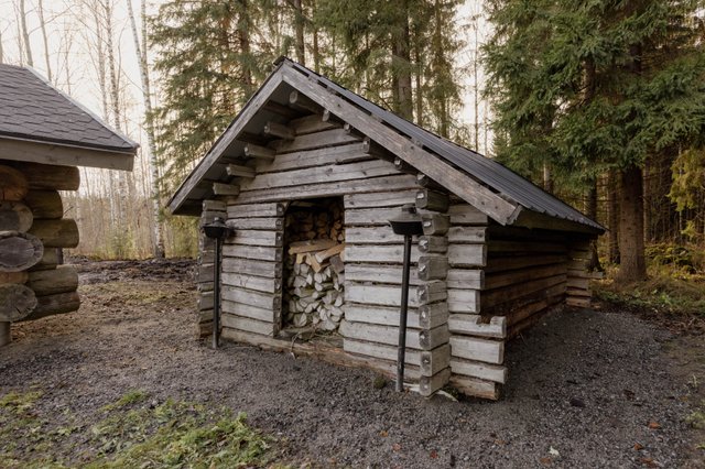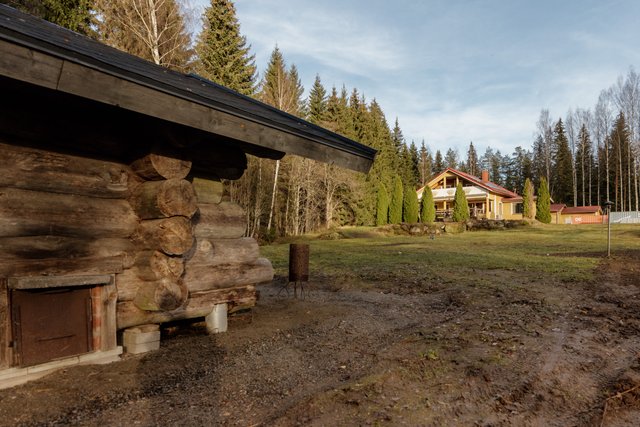 - Autotalli ja savusauna, jonka vieressä hirsinen puuvaaja.