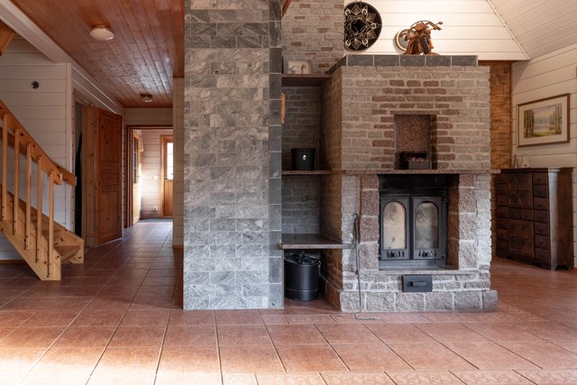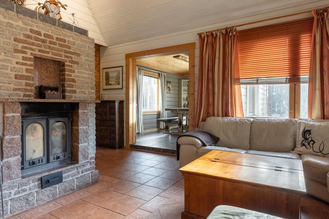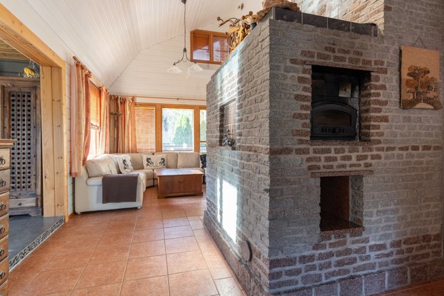 - Käynti takapihan isolle terassille. Olohuoneessa iso varaava takka, jossa leivinuuni on keittiöön päin.