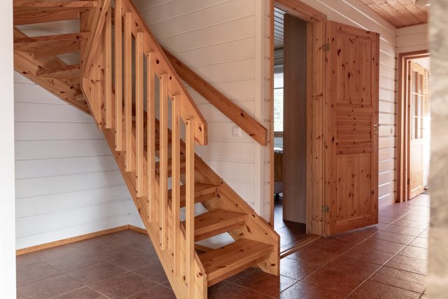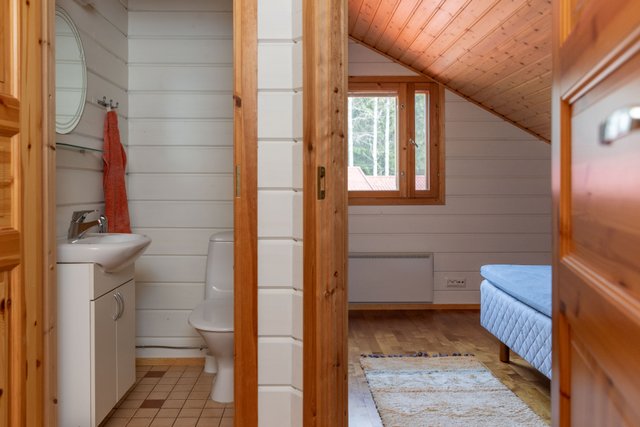 Yläkerrassa on kolme makuuhuonetta, joista yhdestä on kulku parvekkeelle. Lisäksi yläkerrassa on oma pieni wc.