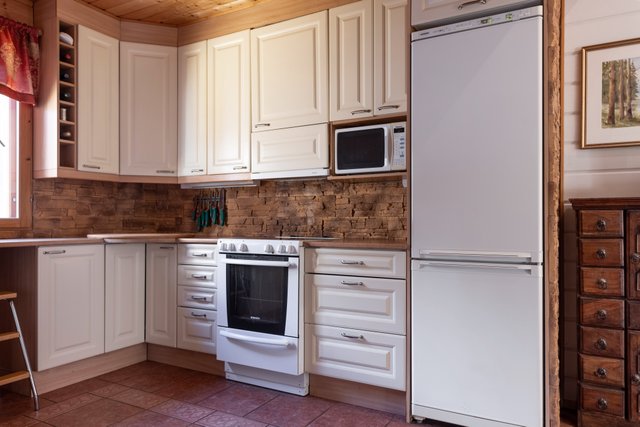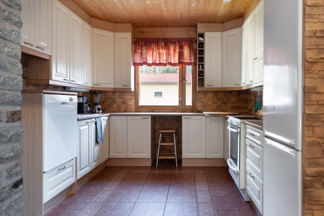 - Uuni, liesituuletin, mikroaaltouuni, astianpesukone, jääkaappipakastin, ja liesi