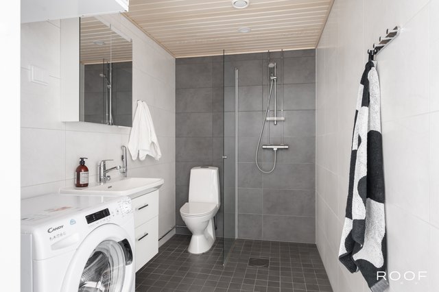 - VARUSTUS: Suihku Suihkuseinä Wc istuin Pesukoneliitäntä Hana Allas Peilikaappi Allaskaapisto Lattialämmitys SEINÄT: Laatta LATTIA: Laatta