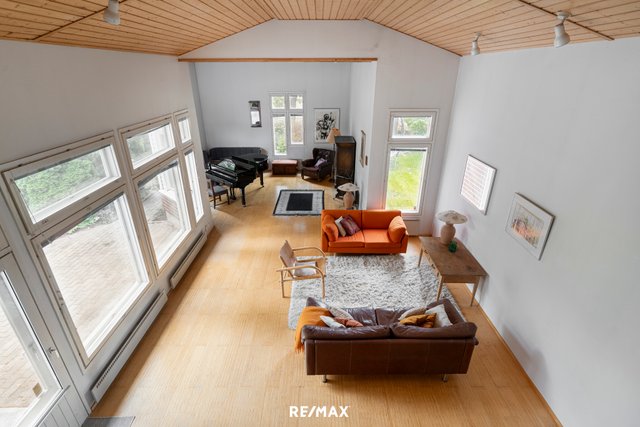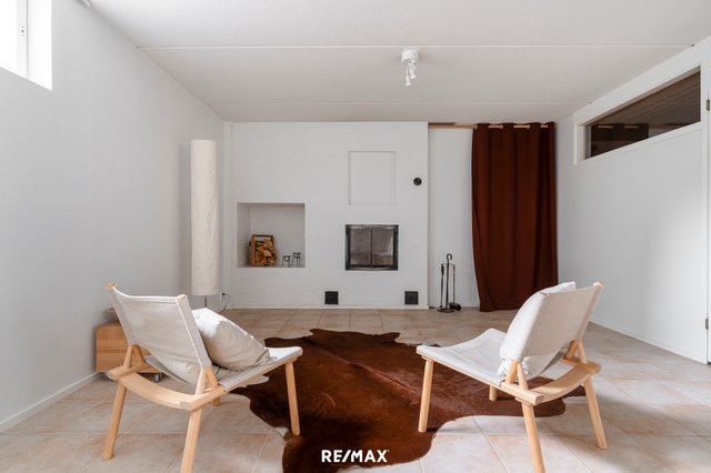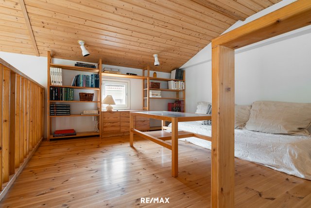 Puoli kerrosta alempana avautuu kodin sydän – upea olohuone, jonka näyttävä huonekorkeus, takka ja suuret ikkunat tuovat valon osaksi sisustusta. Olohuoneesta on käynti suojaisalle ja viihtyisälle piha-alueelle, jossa on tilaa sekä rentoutumiselle että yhdessäololle. Parvi lisää kodin käyttömahdollisuuksia – se sopii täydellisesti työhuoneeksi, kirjastoksi tai rauhalliseksi lukunurkkaukseksi.