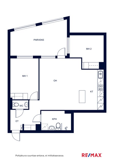 Asunnon keittiö on varustettu nykyaikaisilla laitteilla, kuten jääkaappipakastimella ja astianpesukoneella. Olohuone ja keittiö muodostavat yhtenäisen ja valoisan tilan, jossa on helppo viihtyä. Kaksi makuuhuonetta tarjoavat rauhallisen paikan lepoon, ja lasitettu parveke toimii lisätilana ympäri vuoden.