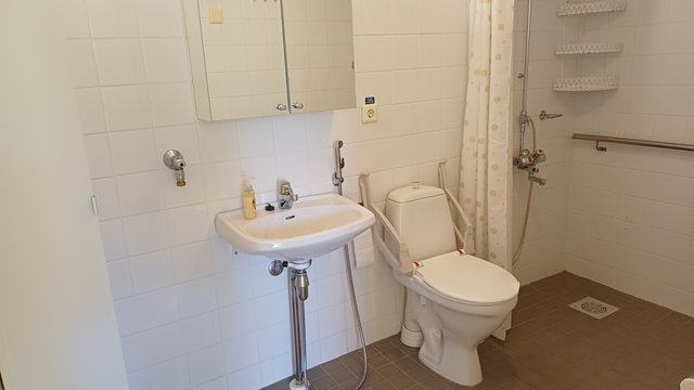 - WC-istuin, peilikaappi, pesuallas, bidee-suihku, suihku, pesukoneliitäntä, ja pyykkikaappi