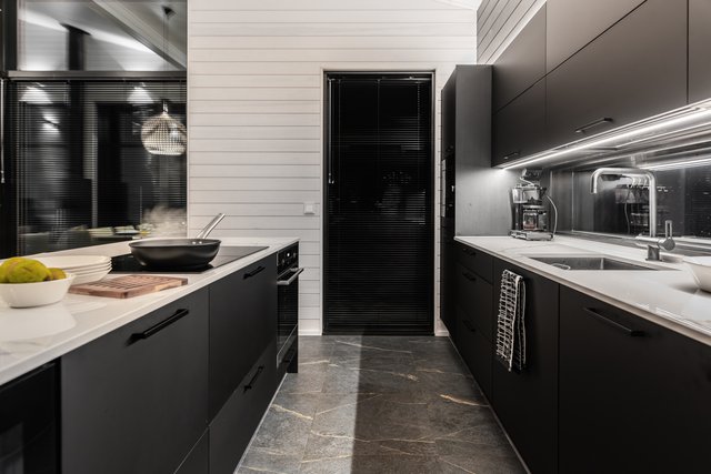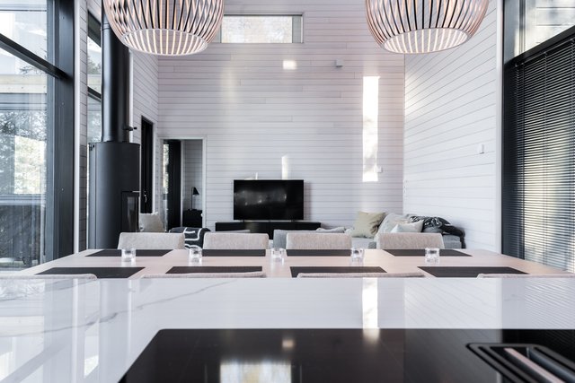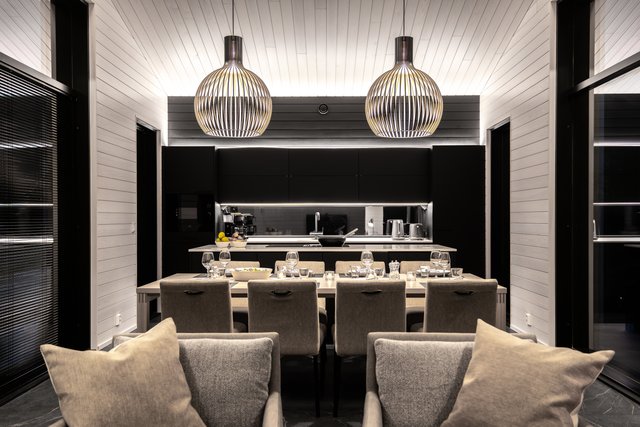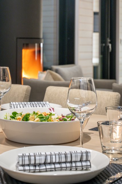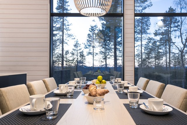 - Varusteet: Jääviileäkaappi, pakastekaappi, viinikaappi, mikroaaltouuni, liesituuletin (liesimalli), induktioliesi, uuni, astianpesukone Ruokailutila sijaitsee keittiön ja oleskelutilan välissä. Upeat avarat näkymät tunturimaisemaan isoista ikkunoista.
