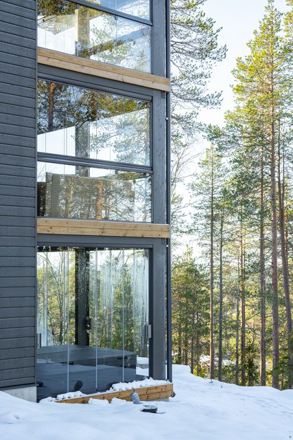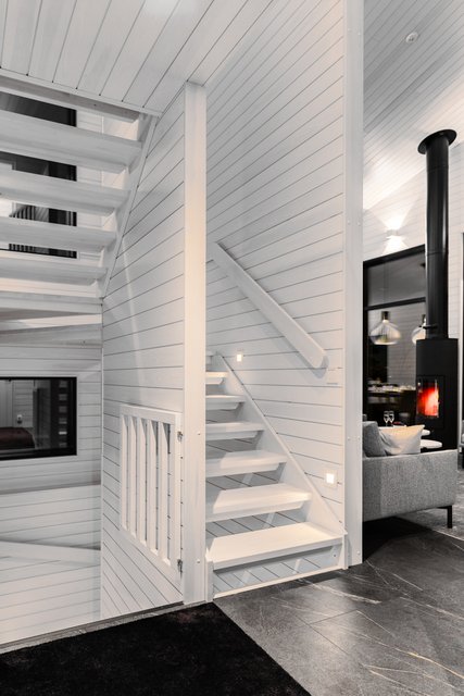 - Olohuone sijaitsee keskikerroksessa, ruokailutilan vieressä. Upeat länteen avautuvat näkyvät tunturimaisemaan.