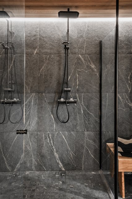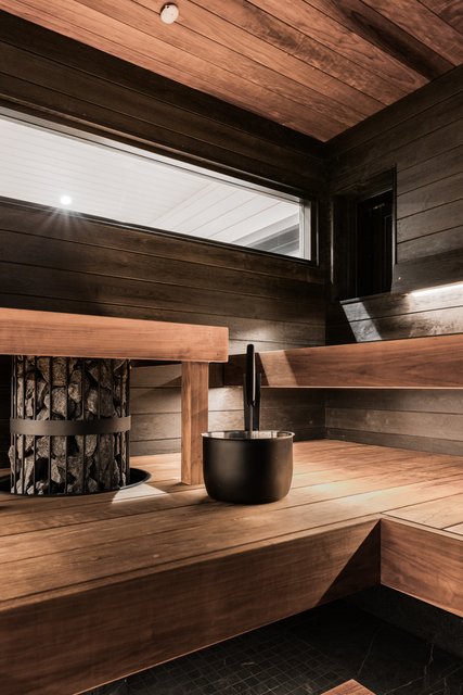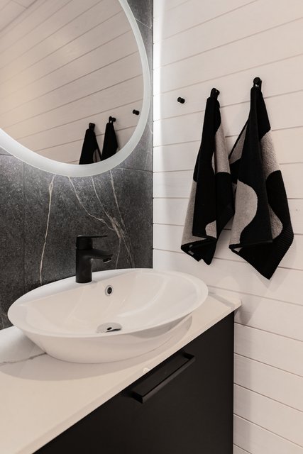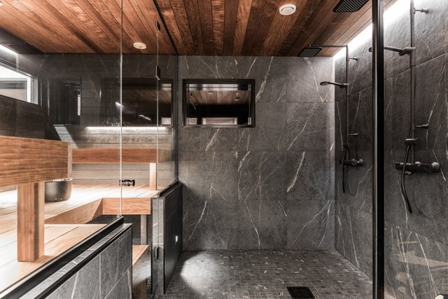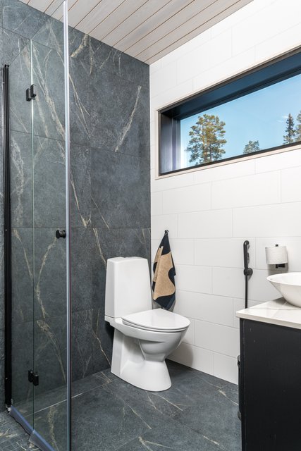 - Kylpyhuoneita 2 kpl. Saunatilojen yhteydessä sekä ylimmän kerroksen makuuhuoneen yhteydessä. Pesutiloissa kivitasot.