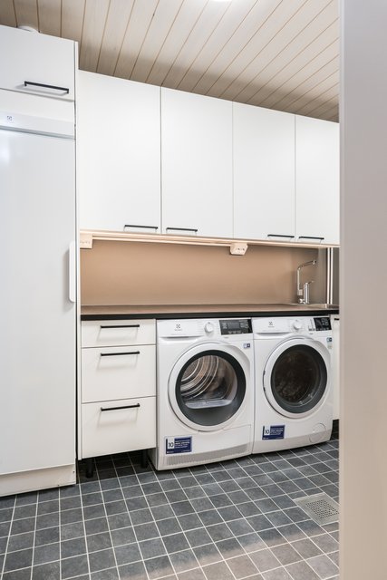 - Pesukoneliitäntä (Tilaa myös pesutornille), pesukone, kuivausrumpu, kuivauskaappi (2 kpl), pyykkikaapit, lattialämmitys, lattiakaivo, pöytätaso, ja uloskäynti