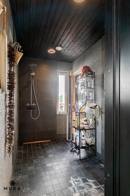 - Päärakennuksessa alakerrassa saunan yhteydessä kylpyhuone, jossa kaksi suihkua. Yläkerrassa päämakuuhuoneen yhteydessä kylpyhuone, jossa suihku ja suihkukaappi. Rantasaunan kylpyhuoneessa kaksi suihkua.