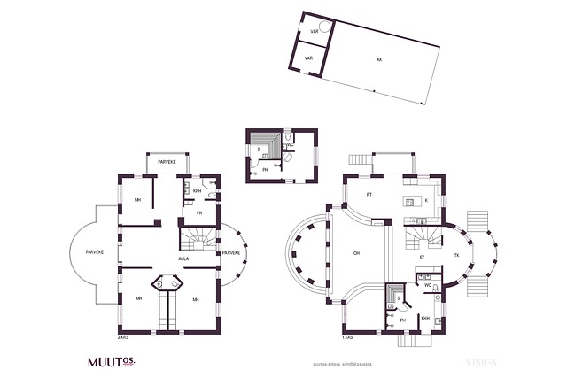 - Pinta-alat perustuvat myyjiltä saatuihin tietoihin ja rakennuspiirrustuksista laskettuihin arvioihin. Pinta-aloja ei ole tarkistusmitattu. Asuintilojen pinta-alaan on laskettu kaikki asumiskäytössä olevat tilat sekä rantasaunarakennus. Muihin tiloihin on laskettu ullakkotilat.