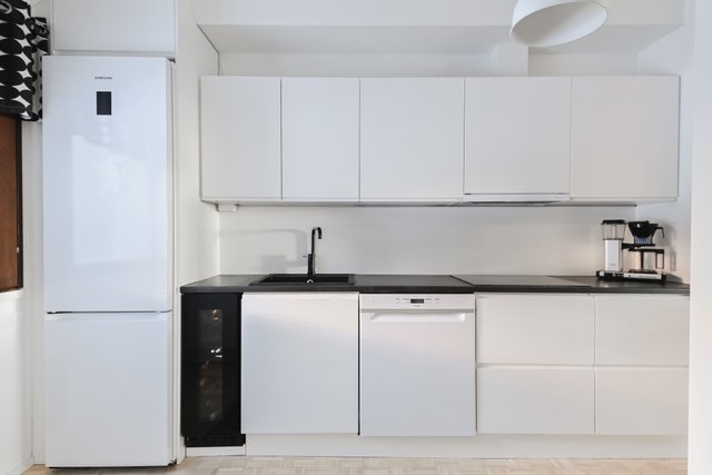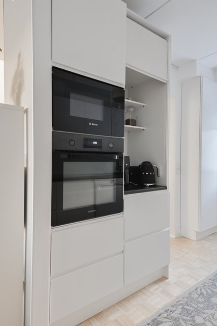 - Jääkaappipakastin, astianpesukone, liesituuletin, erillisuuni, liesi, mikroaaltouuni, ja viinikaappi