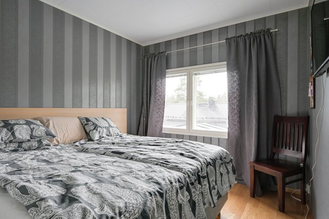 Ylimmässä kerroksessa sijaitsevat kaksi tilavaa makuuhuonetta, jotka tarjoavat hyvät säilytysratkaisut ja rauhalliset puitteet levolle. Täältä löytyy myös toinen pesuhuone/wc, joka lisää asumisen mukavuutta ja käytännöllisyyttä.