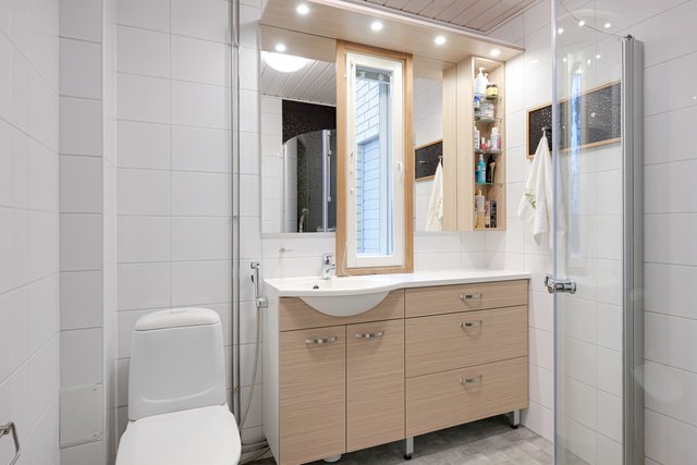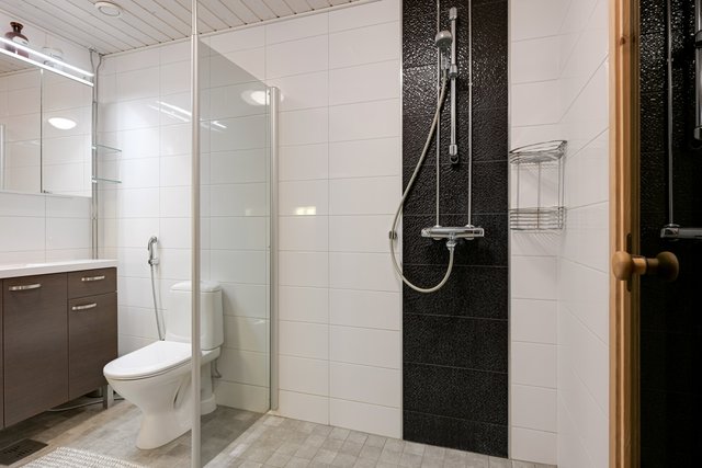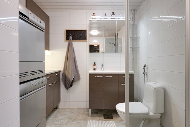- Suihku, suihkuseinä, wc-istuin, pesukoneliitäntä, peilikaappi, lattialämmitys, allaskaappi, bidee-suihku, suihkukaappi, peili, ja pesuallas