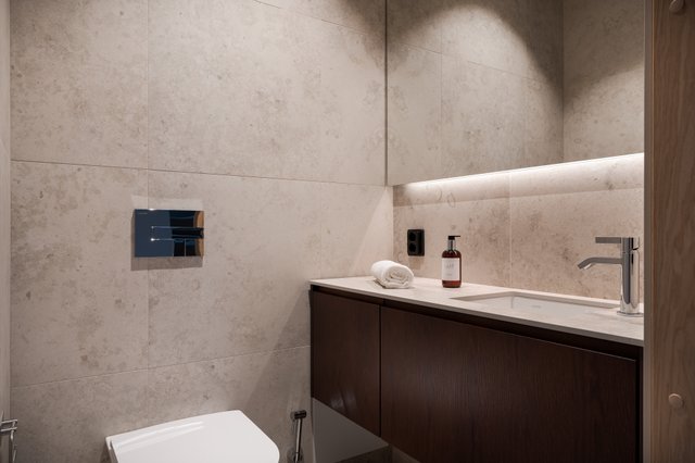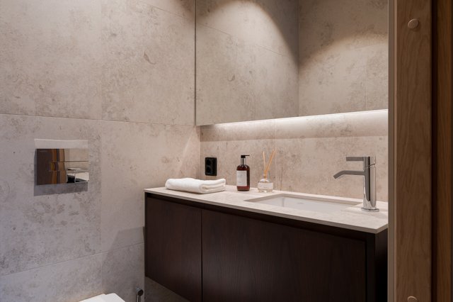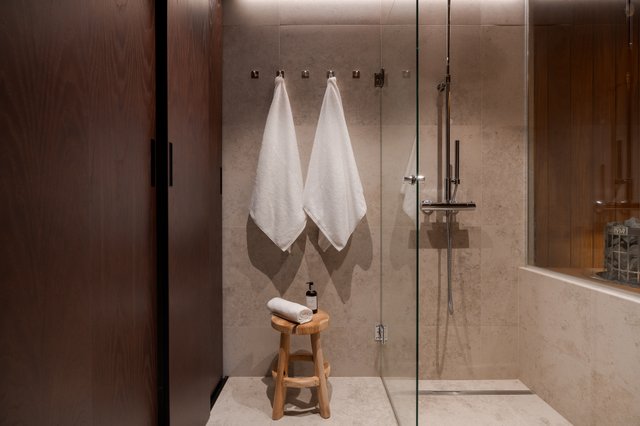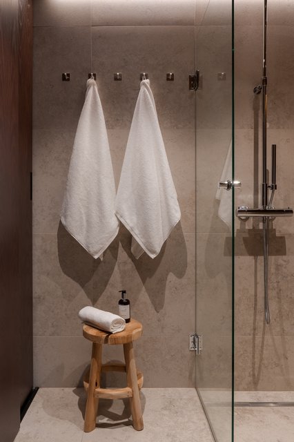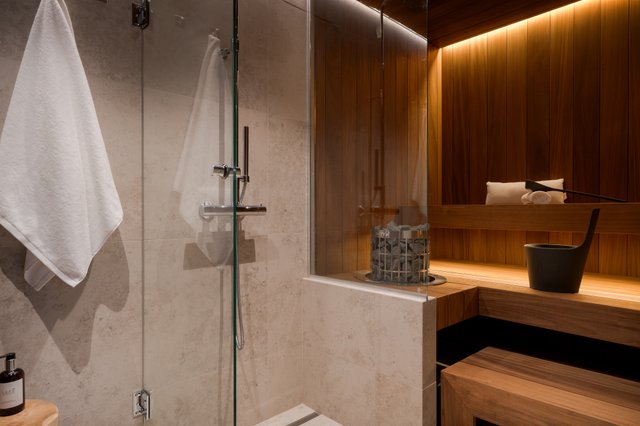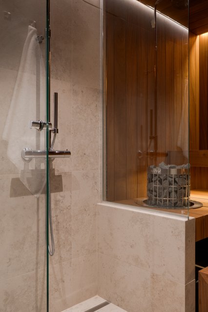 Kodin pesutilat jatkavat samaa hillityn ylellistä linjaa. Luonnonsävyiset laatat, laadukkaat kalusteet ja pehmeä valaistus luovat tilaan lähes spa-henkisen tunnelman. Saunan haapapaneelit ja lasiseinät tekevät siitä kauniin osan kokonaisuutta, ja moderni pylväskiuas tuo löylyihin juuri oikeanlaista Lapin lämpöä.