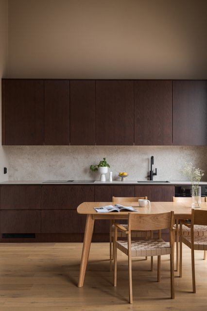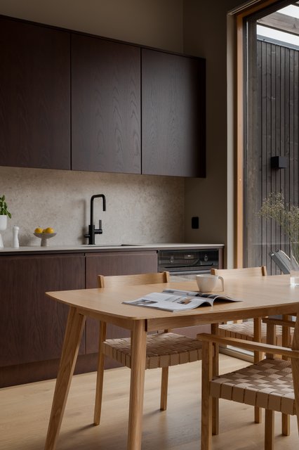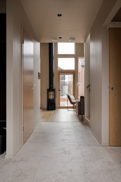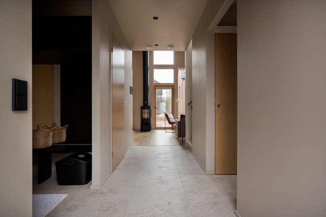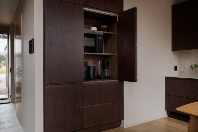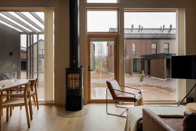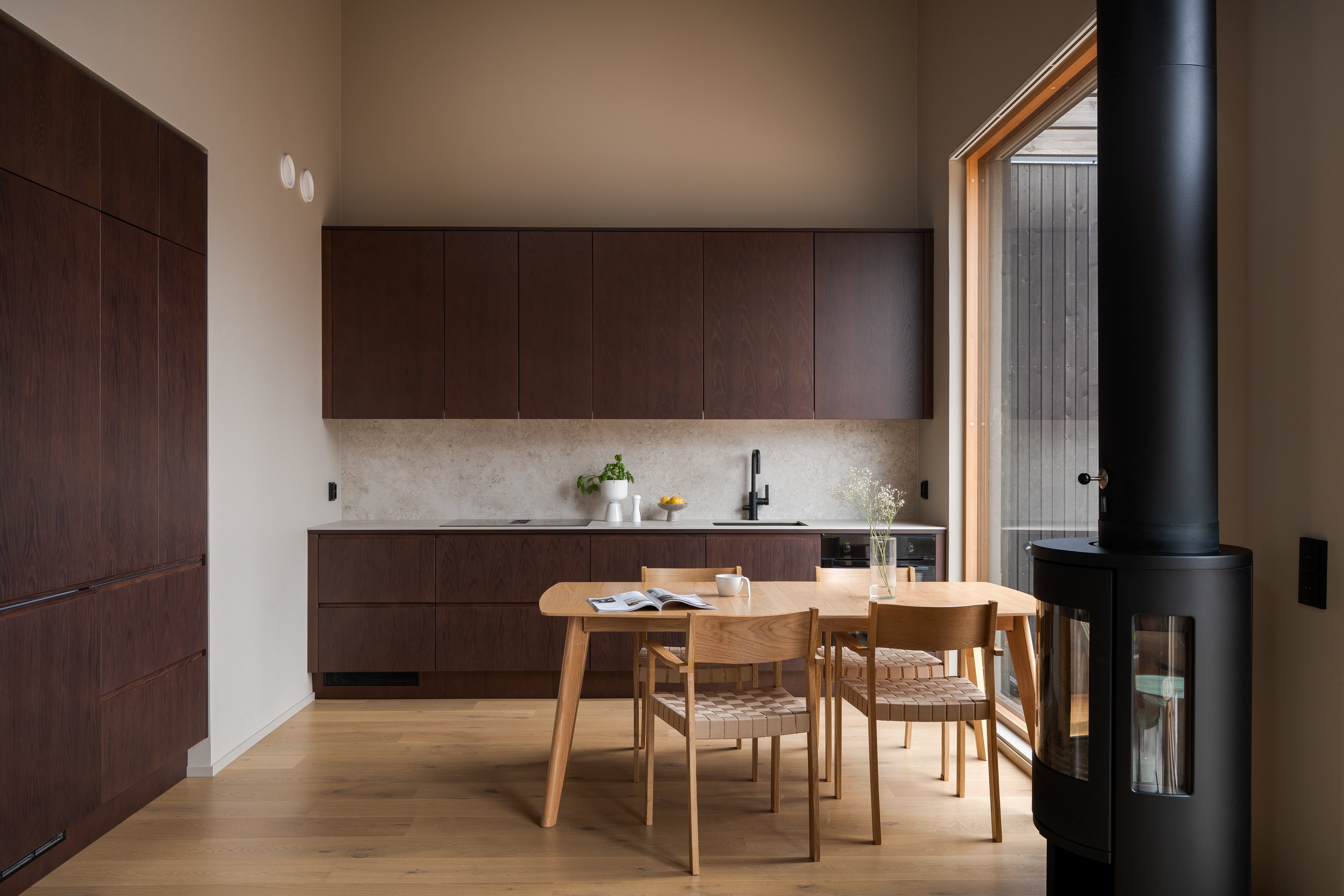 Kodin sydän on avara tupakeittiö, jossa suuret ikkunat tuovat valon osaksi sisustusta ja avaavat näkymät ympäröivään luontoon. Tummasävyinen keittiö kivitasoineen ja integroituine kodinkoneineen huokuu laatua ja hillittyä eleganssia. Tilan keskiössä seisova takka rytmittää oleskelutilaa kauniisti, ja sen ympärille on helppo rakentaa lämminhenkinen paikka yhteisille hetkille.