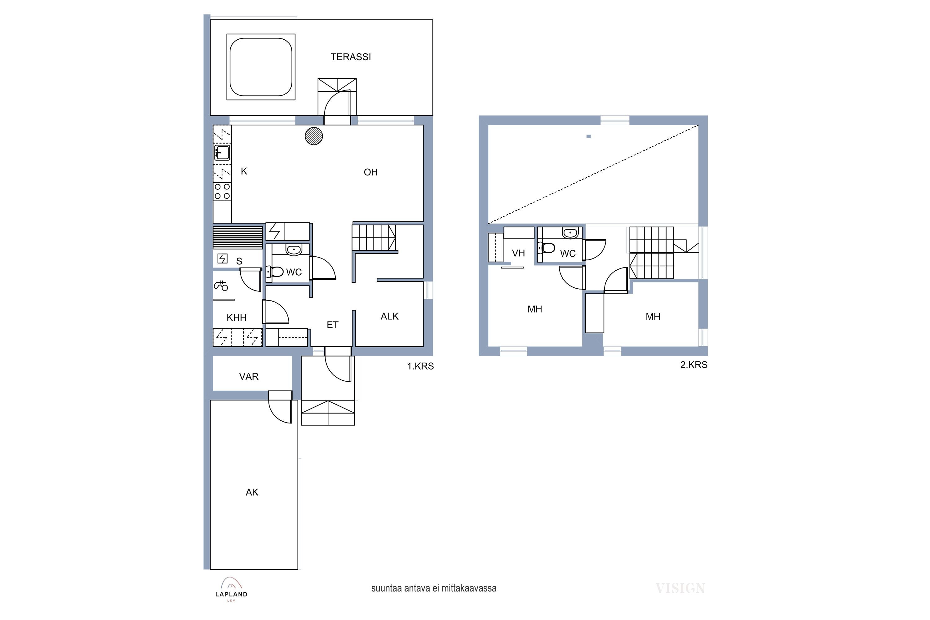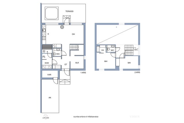 - 2 virallista makuuhuonetta sekä 1. krs myös erillinen alkovi. Alakerran huonekorkeus 2,5 m, alas laskujen kohdalla 2,3 m. Tupakeittiössä korkeaa tilaa auki yläkertaan. Yläkerrassa vino katto, huonekorkeus vähintään 2 m.