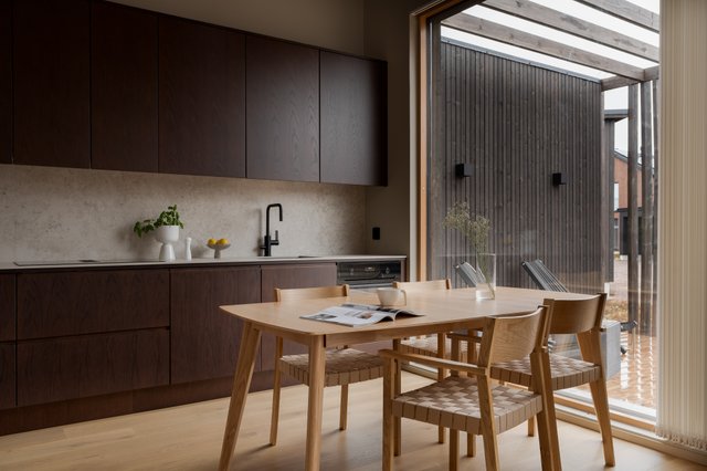 Ruokailutila sijoittuu luontevasti ikkunan äärelle, ja oleskelutilasta avautuu yhteys terassille, jossa voi nauttia Lapin raikkaasta ilmasta ja tuntureiden rauhoittavasta maisemasta. Terassi jatkaa sisätilojen tyyliä. Se on suojaisa, viimeistelty ja täydellinen paikka hitaiden aamujen kahvihetkille.