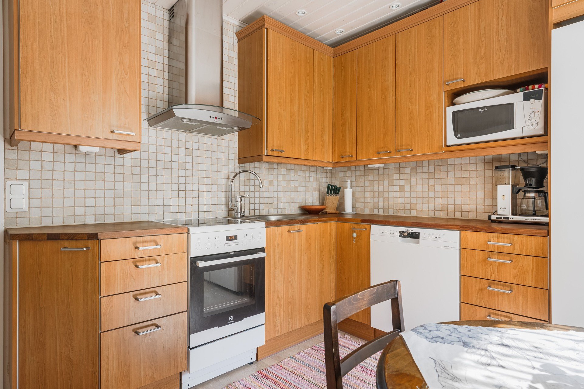 - 2012 uusittu Puustellin keittiö. Pähkinänsävyiset kaapistot, hyvät säilytystilat ja puiset työtasot. Tilaan mahtuu ruokailuryhmä. Parkettilattia uusittu 2012. Väliovi vaihdettu.