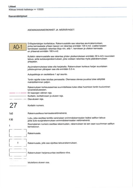 - Rakennusalalle saa rakentaa asuinrakennuksen, jonka kerrosalasta yhteen tasoon voi rakentaa enintään 120 k-m2. Lisäksi toiseen kerrokseen saadaan rakentaa tiloja niin, että 1. kerroksen ja ullakon kerrosala on yhteensä enintään 160 k-m2. Kullekin rakennusalalle saa rakentaa yhden yksikerroksisen enintään 30 k-m2:n suuruisen talous- ja/tai autosuojarakennuksen, joka voidaan rakentaa myös päärakennuksen yhteyteen.