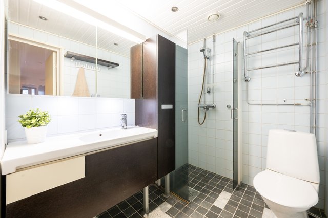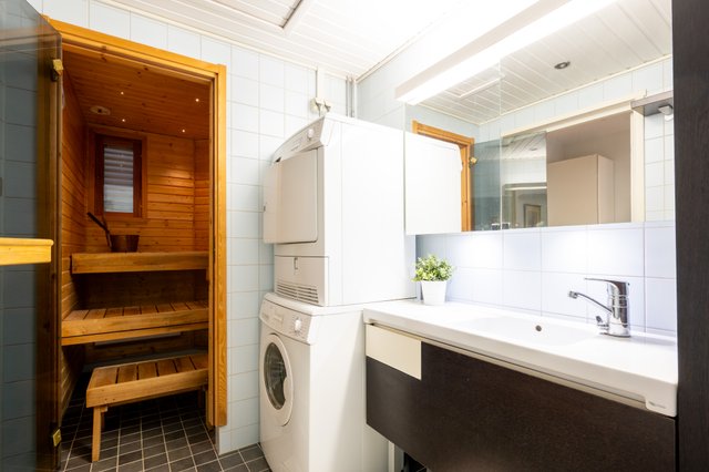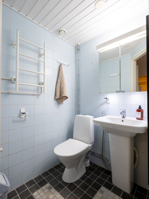 - WC-istuin, suihku, suihkuseinä, pesukoneliitäntä, lattialämmitys, peilikaappi, pesuallas, allaskaappi, ja vesikiertoinen rättipatteri