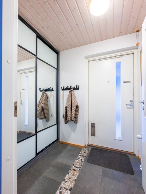 - Tilava ja avara eteinen, lattia parkettia ja seinät maalattu, nurkassa siivouskomero. Tuulikaapin lattia on laatoitettu, seinät maalattu ja tuulikaapissa on iso liukuovikaapisto.