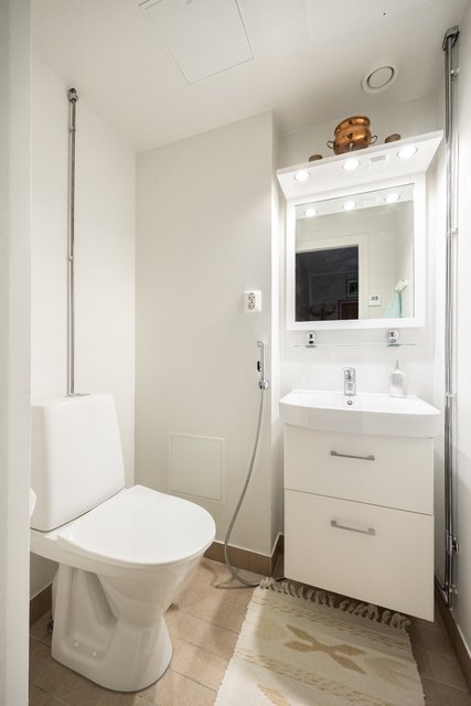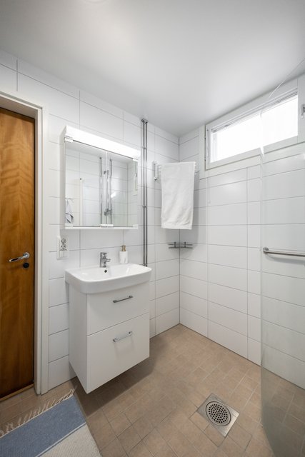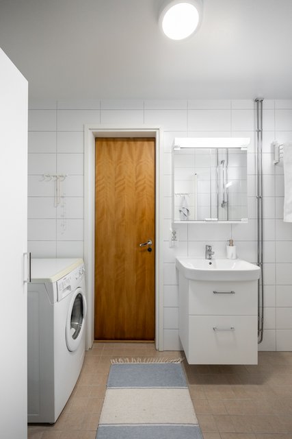 - Suihku, pesukoneliitäntä, pesuallas, allaskaappi, peilikaappi, suihkuseinä, ja pyykkikaappi